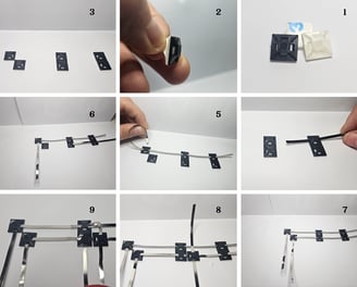 יש לקלף ולחשוף את הדבק הדו צדדי מתחתית בסיסי הפלסטיק(ריבועי פלסטיק) ולהדביק את הבסיסים במקום בו היונים נמצאות ונוהגות להגיע, יש לשחיל את פס ההולכה במסלול אותו יצרת בעזרת בסיסי הפלסטיק. ניתן לבצע היסתעפויות פניות וצמתים מכל נקודה